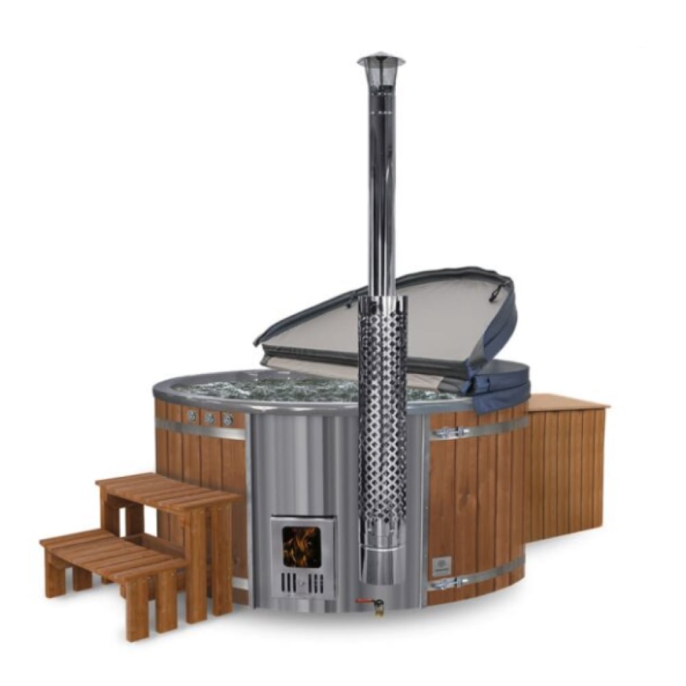 Another important note: a hot tub with an integrated wood-burning stove features a raised section, which can be a great seating area for kids or a comfortable spot to relax.