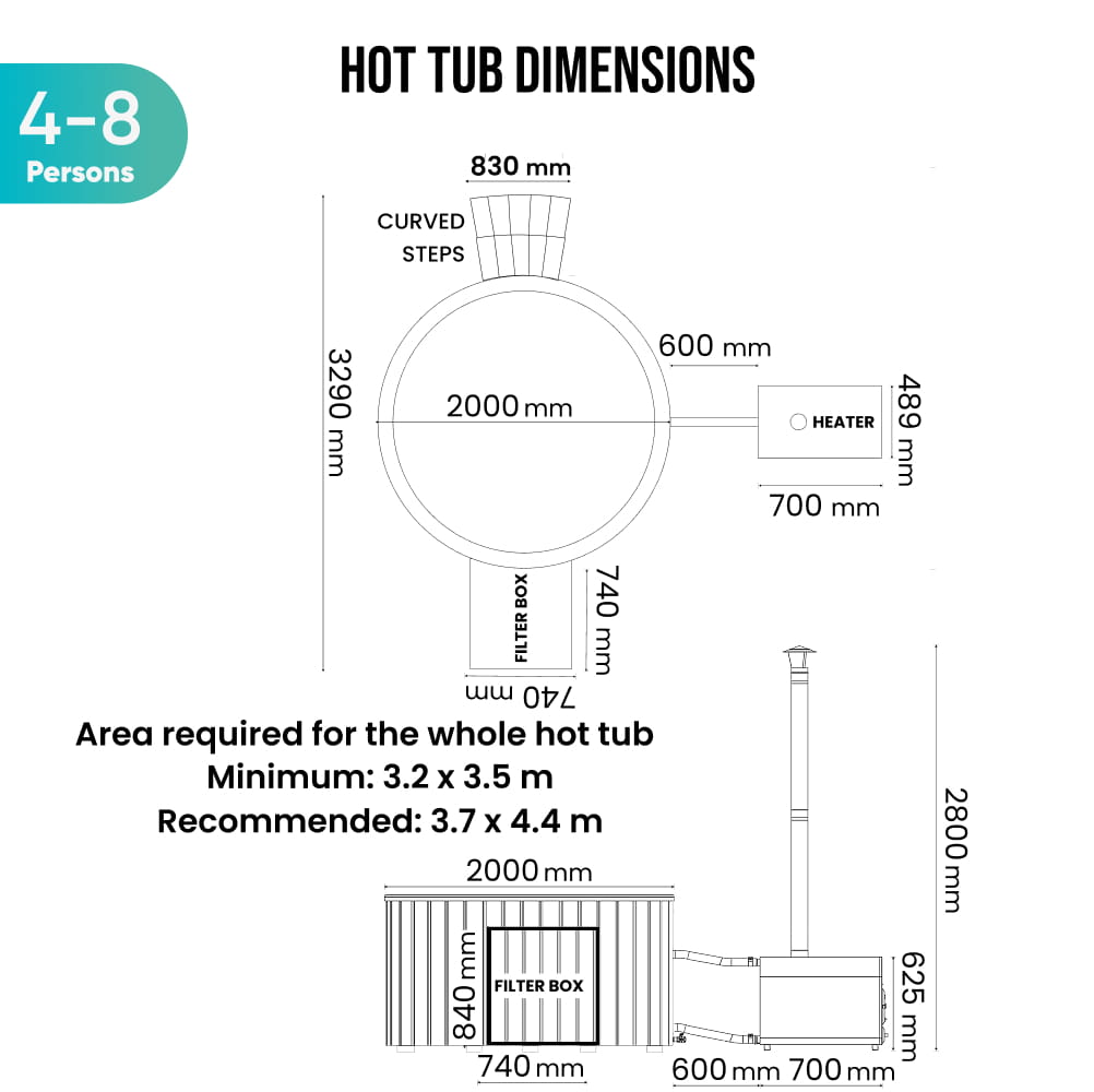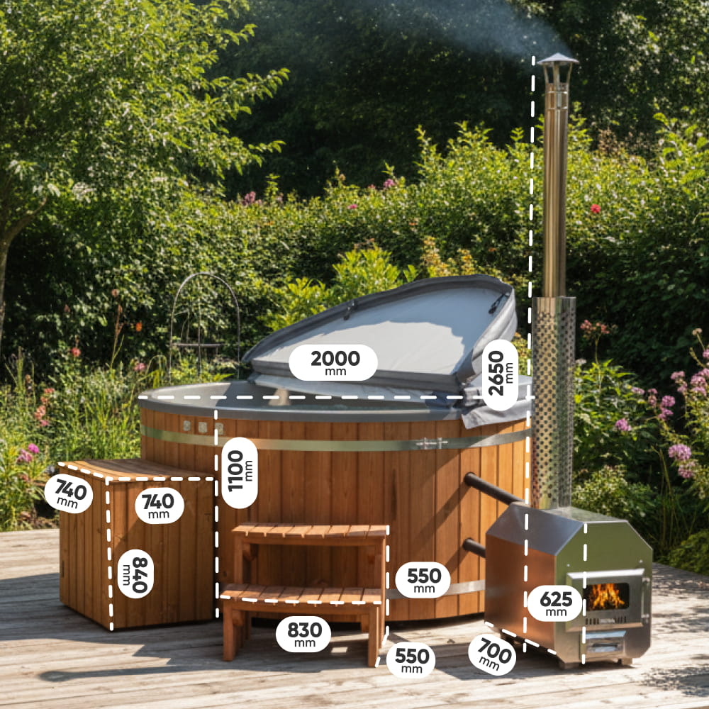 Premium Sandfilter Wood Fired Hot Tub with Jets | External stove | 24 jets | 4–8 seater