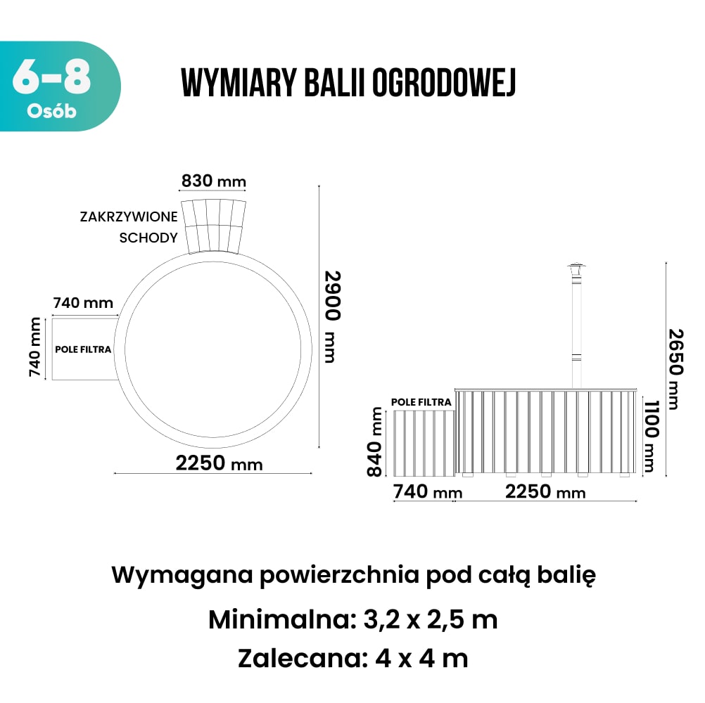 Kwadratowa balia ogrodowa | zewnętrzny piec na drewno | filtr piaskowy z lampą UV-C | 16 dysz hydromasażowych | dla 4–8 osób