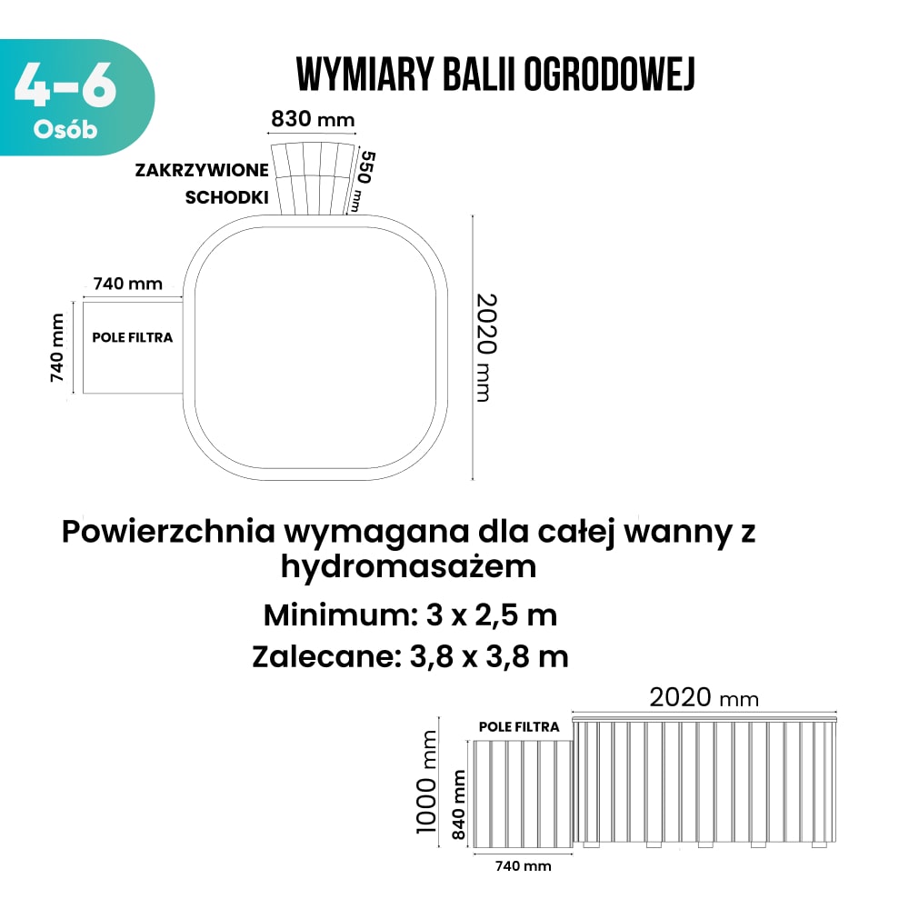Kwadratowa balia ogrodowa | zewnętrzny piec na drewno | filtr piaskowy z lampą UV-C | 16 dysz hydromasażowych | dla 4–8 osób